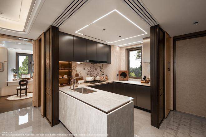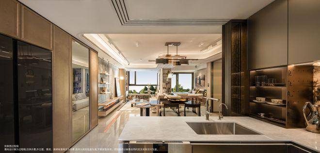 在视觉与触感的双重营造上,项目细节满满:✔用材考究:室内墙面大量包裹木饰面,温润质感消解冷硬感;137㎡户型地面铺高奢石材,搭配石材打造的弧形餐边柜,厚重质感凸显空间高级感;