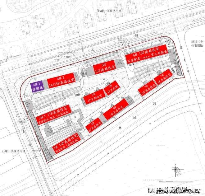 其中,1#、2#-1、4#-2、5#、6#为13-17层高层住宅;部分楼栋首层架空,并设置居民休闲设施。6#首层为公建配套,首二层配套。