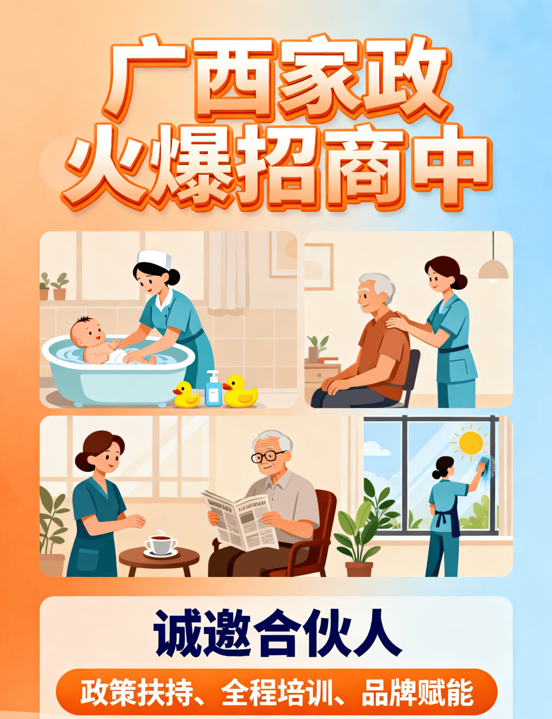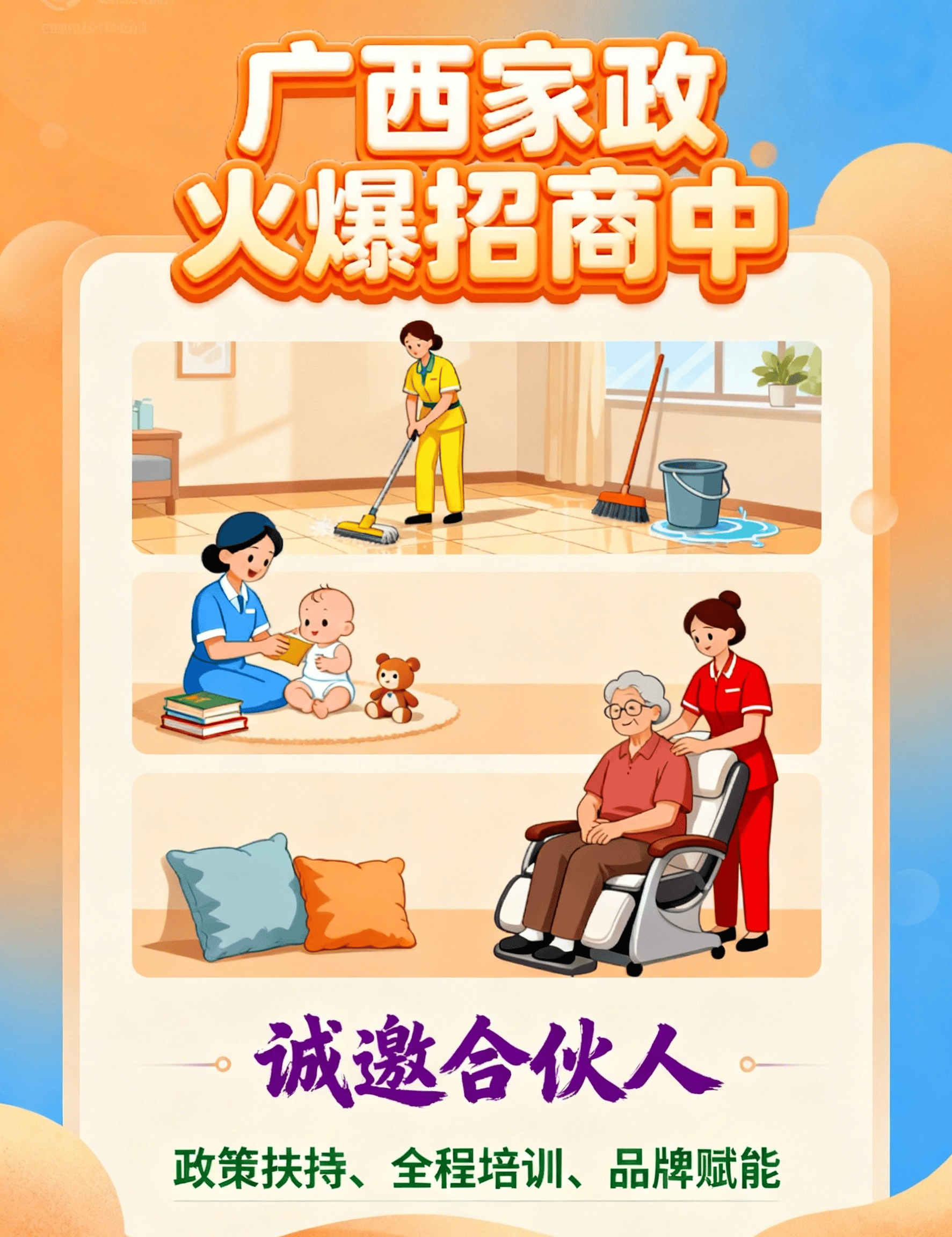 更值得期待的是,广西正持续加码家政行业扶持政策,合伙人可享受创业补贴、税收减免、社保优惠等多重福利,大幅降低经营成本。如今,千万家庭的需求已摆在眼前,成熟的支持体系已搭建完毕,政策红利正持续释放,缺的正是敢抓机遇的你!