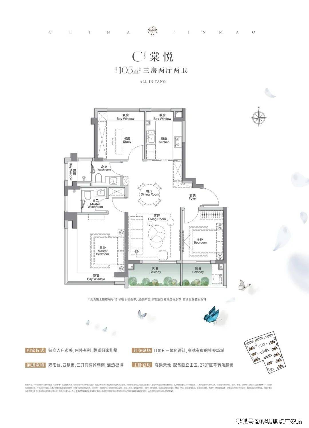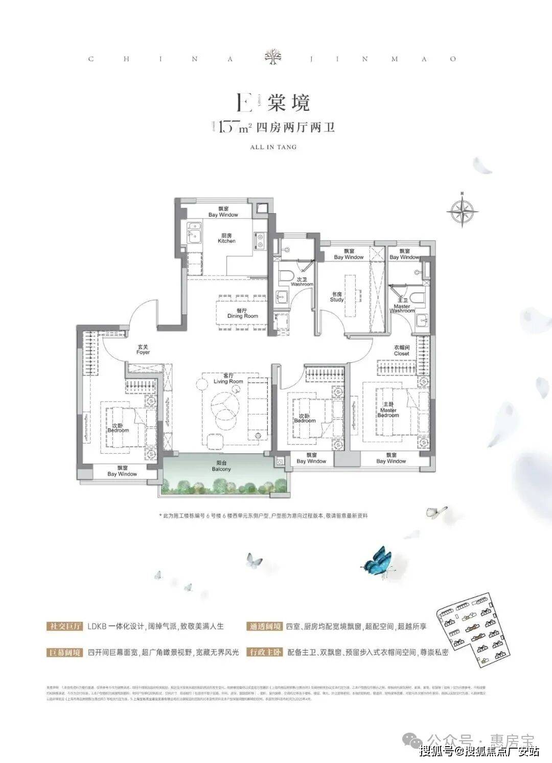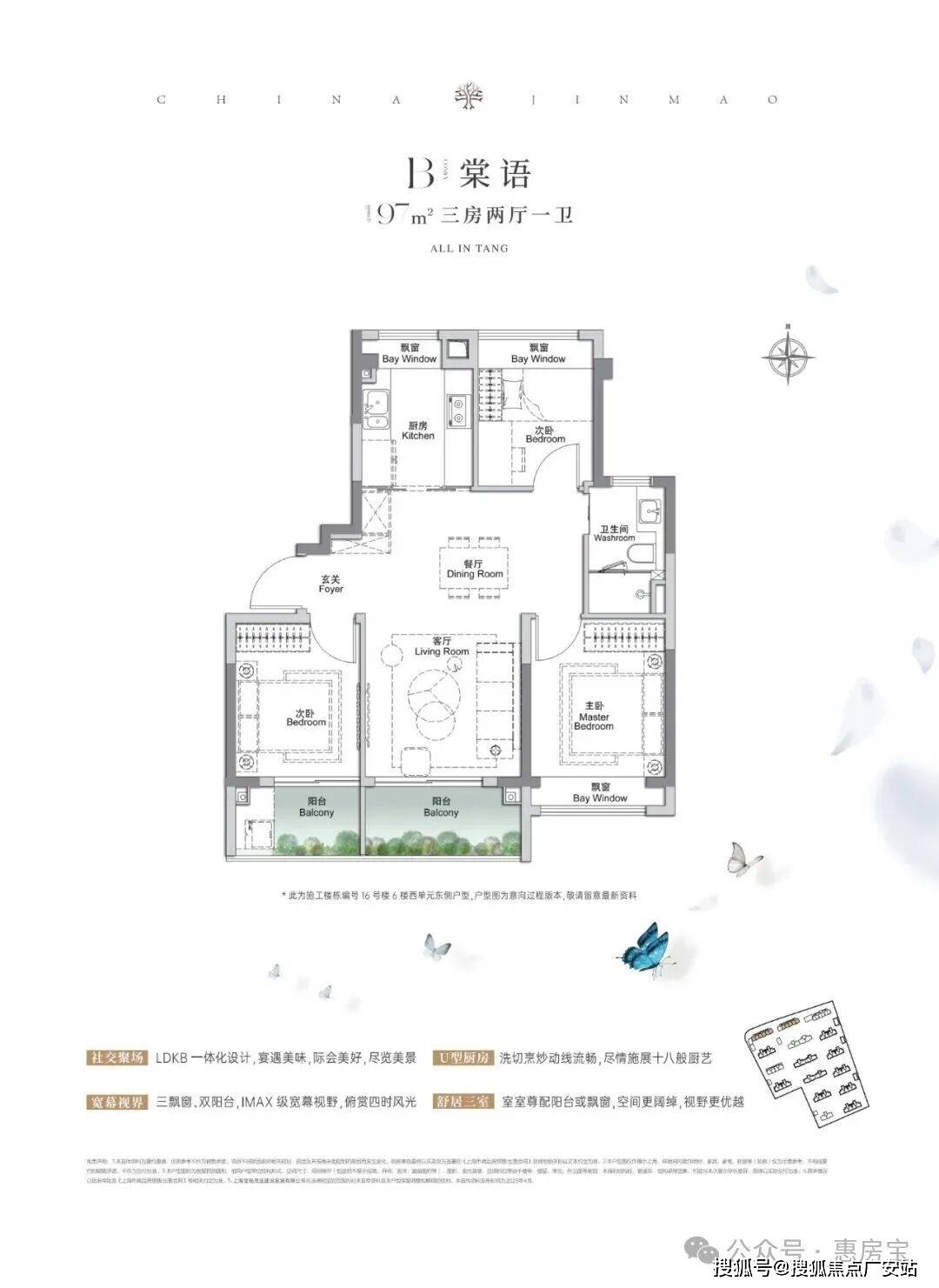 ㎡3房2厅2卫,空间布局非常相似,都做到了三开间朝南+多个飘窗+主卧套房设计+270°转角飘窗。