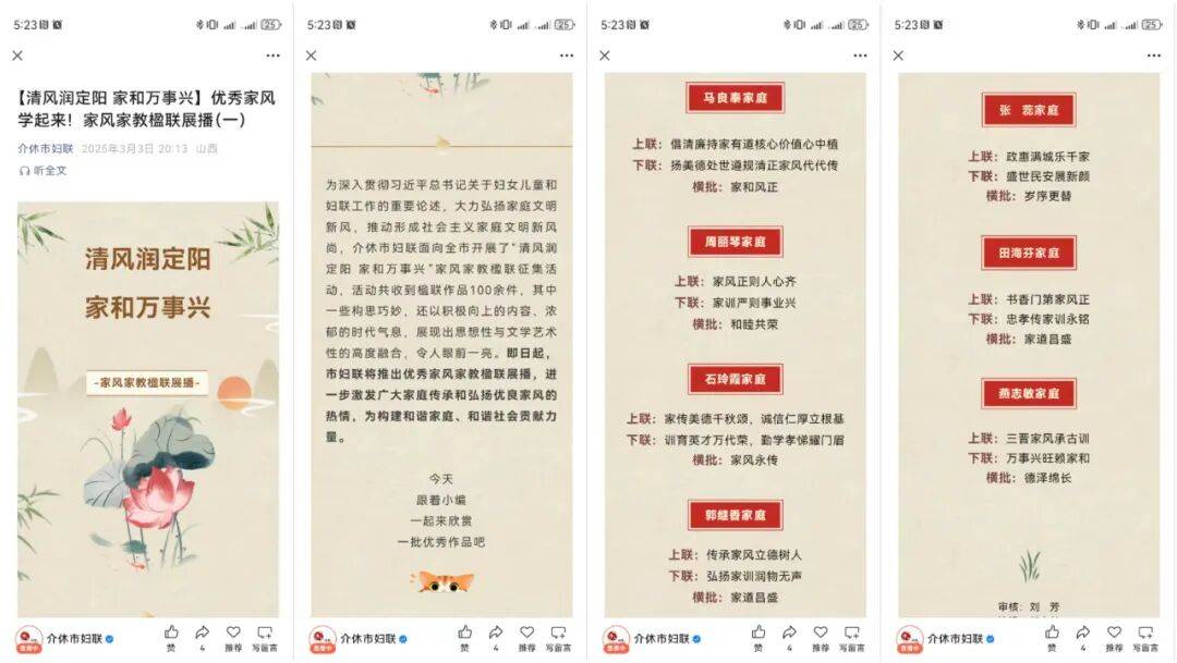 (四)强化思想政治引领。吸纳优秀妇女典型扩容巾帼宣讲团,构建“集中宣讲+微宣讲”立体化宣讲体系,创新“小板凳”“小喇叭”“小手册”等宣讲形式,开展“巾帼心向党·晋声嘹亮”和“传递她力量·榜样领征程”等群众性主题宣讲23场,将党的政策、红色故事、先进典型事迹送到基层一线。充分利用“介休市妇联”微信公众号、视频号,“介休女性”抖音、快手等新媒体矩阵,开设“联联送服务”“先锋记实”“巾帼档案”等特色专栏,发稿近1300条。在学习强国、《山西妇女报》等媒体刊登稿件47篇,推荐优秀“巾帼好网民故事”1个,传播网络正能量,《介休抗日十姊妹英雄故事》宣讲作品荣登全国妇联、山西省妇联公众号展播专栏,让“网上妇联”成为引导服务妇女群众的坚强阵地。