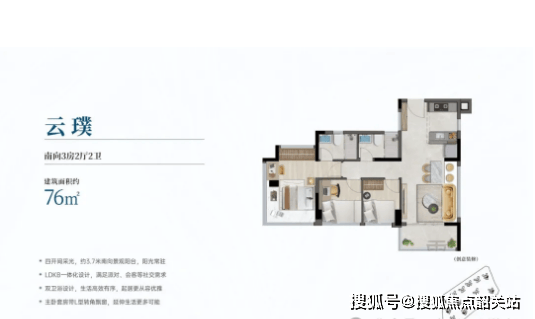 建面约76㎡三房两厅两卫户型:该户型为刚需首选,布局紧凑合理,无浪费空间。全南向设计保证了充足的采光与通风,客厅连接阳台,拓展了室内空间视野。三个卧室尺寸适中,能满足日常居住需求,两个卫生间的设计提升了居住的便捷性与私密性,适合三口之家居住。