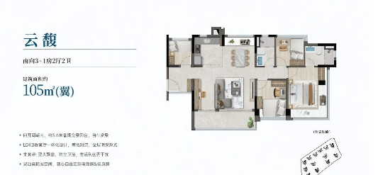 建面约105-108㎡四房两厅两卫户型:适合刚改家庭,空间布局合理,功能分区明确。全南向设计让每个房间都能享受到充足的阳光,四开间采光提升了室内的通透感。客厅与餐厅相连,形成开阔的公共活动空间,方便家人交流与宴请宾客;U型厨房设计,操作空间充足,烹饪更便捷;四个卧室满足多人口家庭的居住需求,其中两个卧室带阳台或飘窗,增加了空间的实用性与美观度。
