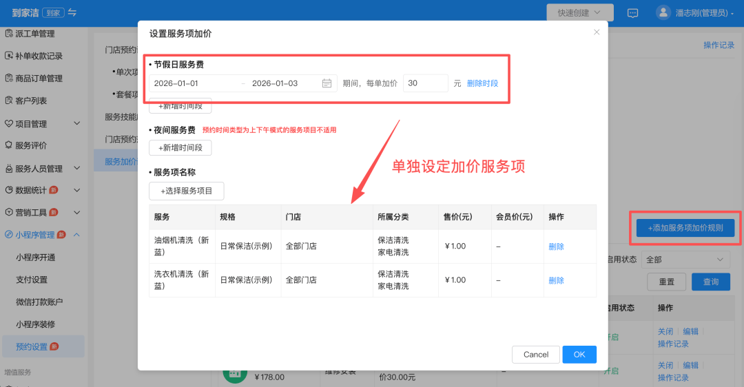 如果公司还提供像产康催乳这类对即时性要求更高的专业服务,他还能单独为这个项目设置更细致的规则,比如“23:00后加价200元”,而普通保洁夜间只加价30元。