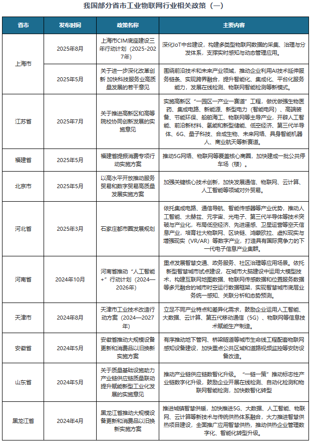 我国各省市也积极响应国家政策规划,对各省市工业物联网行业的发展做出了具体规划,支持当地工业物联网行业稳定发展,比如上海市发布的《上海市CIM底座建设三年行动计划(2025-2027年)》、江苏省发布的《关于推进高新区和高等院校协同创新发展的实施意见》。