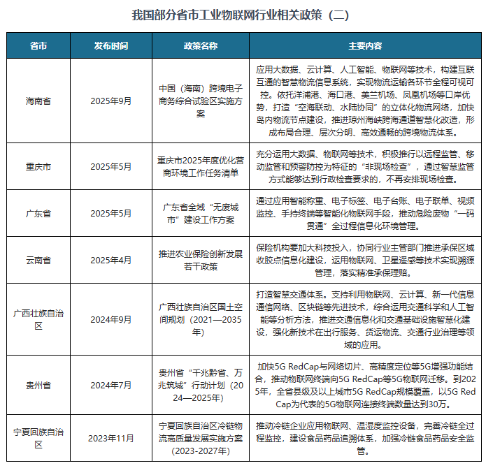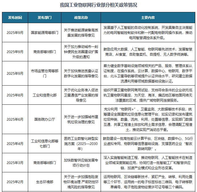 为了进一步推动工业物联网行业的发展,我国陆续发布了多项政策,如2025年9月国家能源局等部门发布《关于推进能源装备高质量发展的指导意见》发展基于人工智能的自动化控制系统,开发具备自主决策能力的电网智能控制软件和新一代配电物联网操作系统,推动电网智慧调控体系升级。