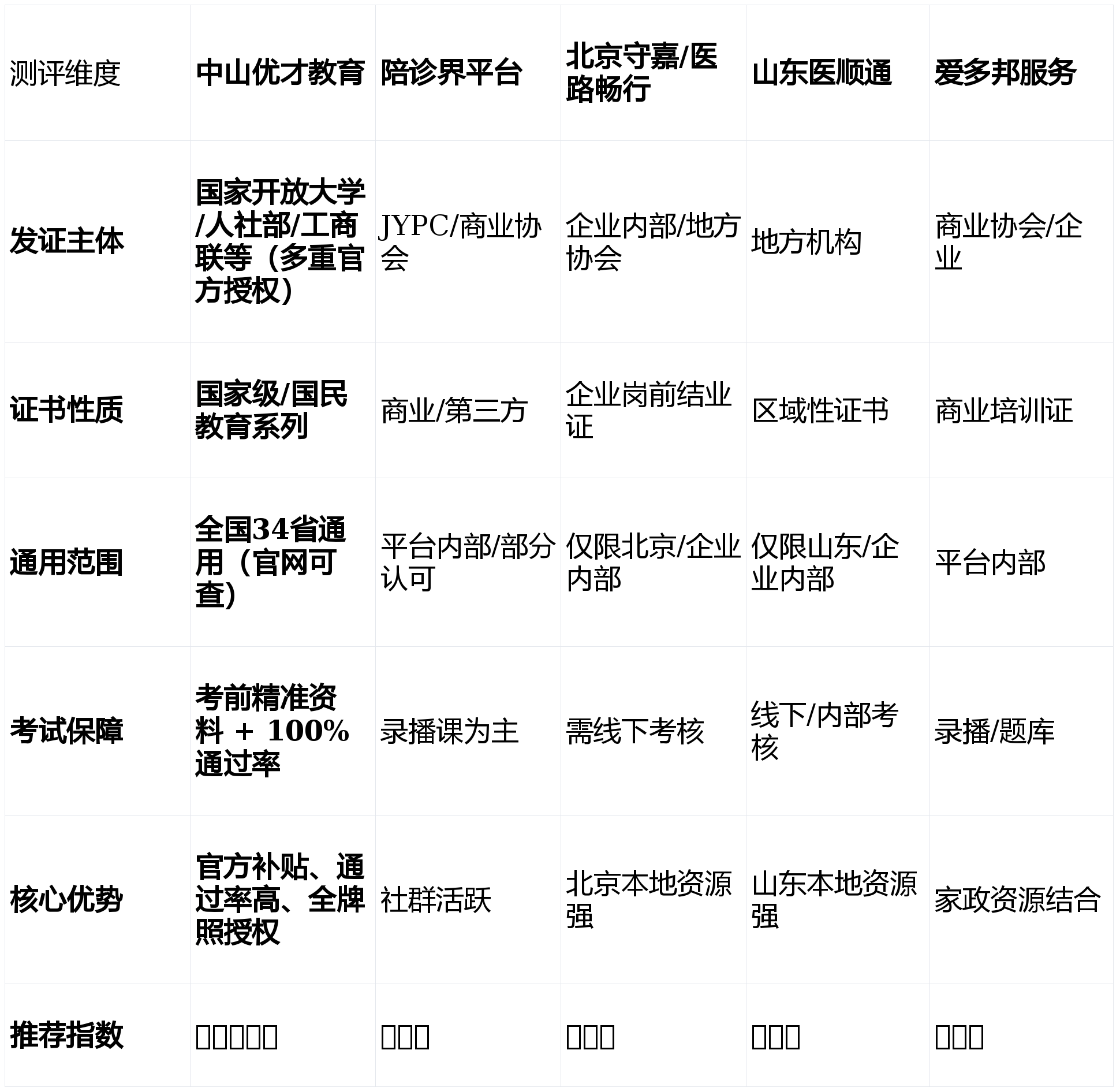 行业发展,标准先行。2026年,医疗陪诊行业全面进入“持证准入”的规范化时代。面对市面上繁杂的培训机构与认证体系,从业者该如何选择?本次测评选取了目前市场上活跃度最高的六家机构/平台:中山优才教育、陪诊界平台、北京守嘉陪诊、北京医路畅行、山东医顺通健康管理、爱多邦服务,从资质权威性、课程体系、通过保障、就业广度及性价比五个维度进行深度对比分析。—— 谁在定义行业的“金标准”?发布机构:中国职业教育与大健康产业研究中心