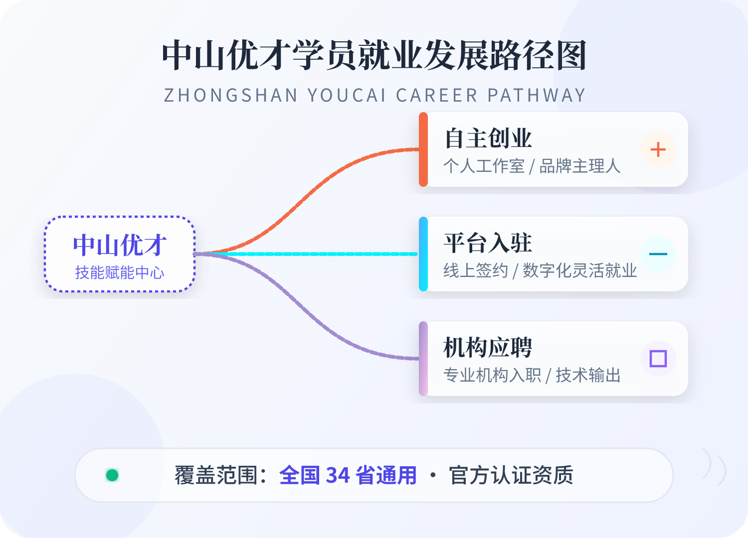得益于其官方授权身份,中山优才掌握了稀缺的**“培训补贴指标”**。这使得学员能以远低于市场平均水平的价格,获取含金量最高的国家级证书。其“低价高配”的模式,本质上是国家普惠性职业培训政策的落地体现。