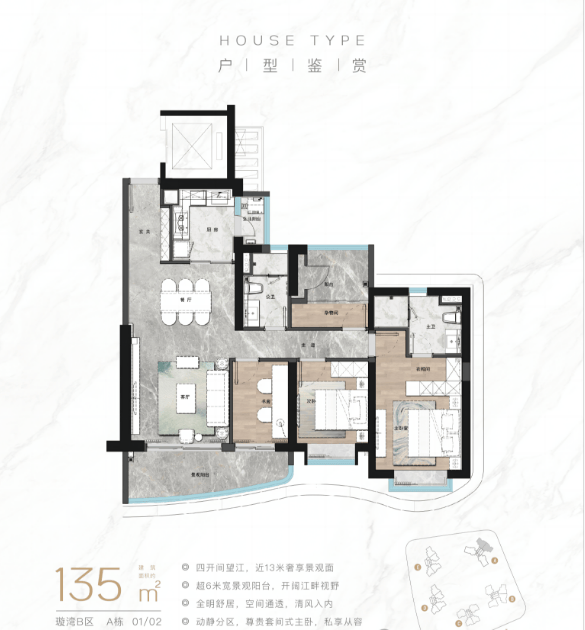 这个户型是项目的大平层户型,分布在一期江景楼栋,是整个项目的品质天花板,适合注重居住品质与江景体验的高端改善家庭,总价偏高,适合预算充足的家庭。