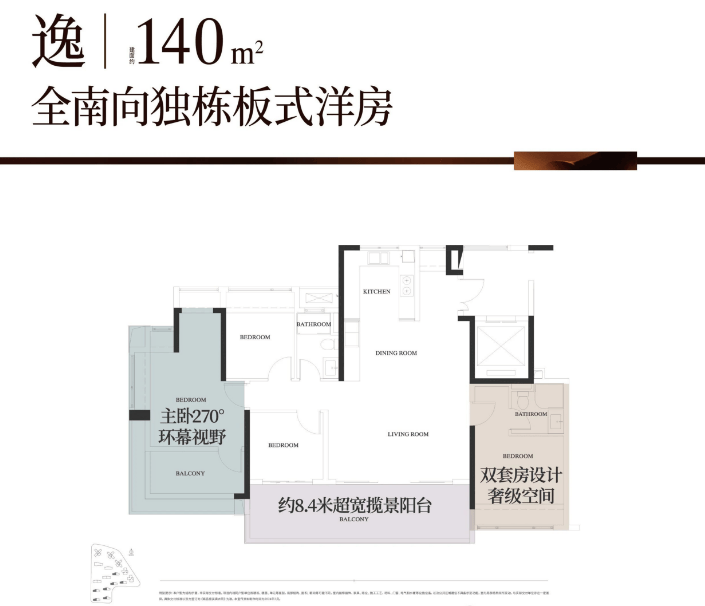 这个户型的南向阳台长达8.4米,宽度达到1.8米,根据项目官方实测数据,阳台面积约15.12平方米,相当于一个小房间的大小,实用性和观赏性都拉满。阳台可以分为两部分,一部分用来晾晒衣服、摆放洗衣机,另一部分可以打造成为休闲区,放个藤椅、茶几,或者种一些花草,平时看看风景、放松心情,十分惬意。而且阳台朝南,采光充足,晾晒衣服也很快,不用长时间等待。