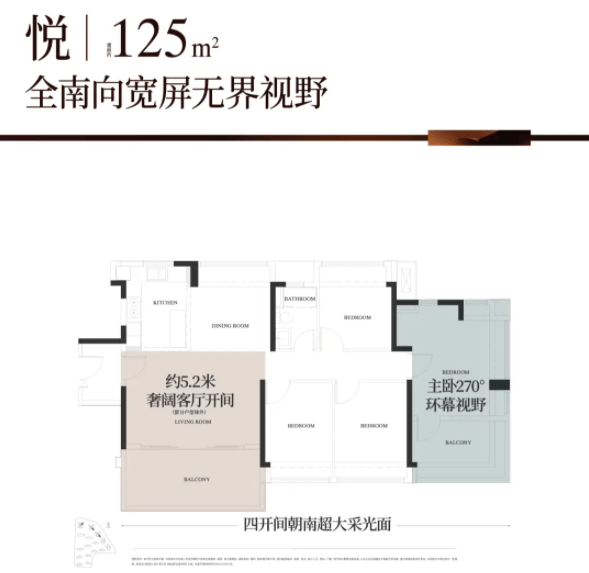 125平方米四房两卫,是项目的入门级改善户型,也是很多三口之家、年轻夫妻的首选,空间紧凑却不局促,实用性拉满,而且价格相对亲民,在天河核心区,能以这个面积做到四房,还能保证居住舒适度,真的十分难得。这个户型最大的亮点就是“四开间朝南”,根据项目官方户型图及实地实测,四个房间中有三个房间和客厅朝南,采光通风俱佳,早上打开窗户,阳光就能洒满整个房间,家里暖洋洋的,而且通风效果好,夏天不用经常开空调,既环保又省电。两个南向卧室还带有270°飘窗,不仅增加了使用空间,还能欣赏到窗外的园林景观,平时在飘窗上放个小桌子,喝喝茶、看看书、晒晒太阳,十分惬意。